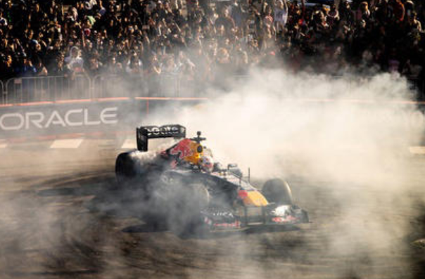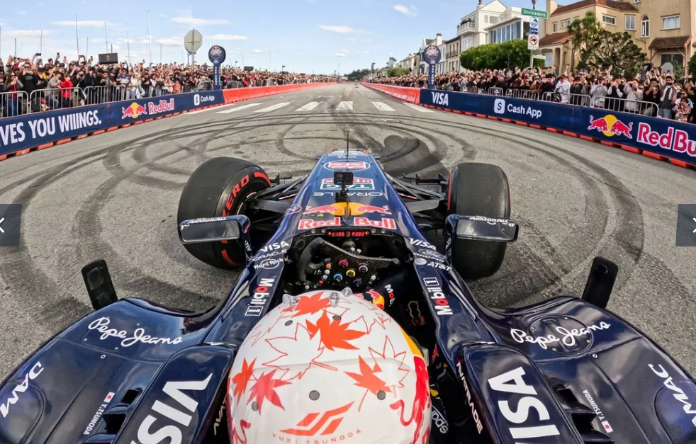 角田裕毅がF1マシンのコクピットに戻ってきた。サンフランシスコでRB7をドライブ……しかしマシンが大炎上!